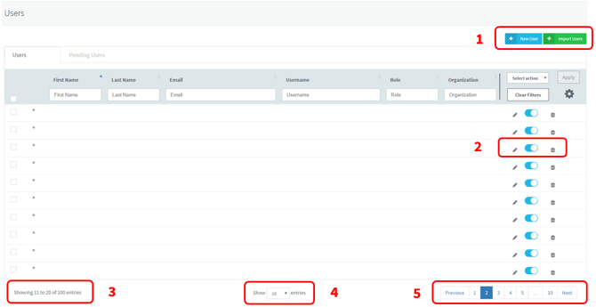 - Use this button to select from 10, 25, 50, or 100 entries to be displayed on the user list*.